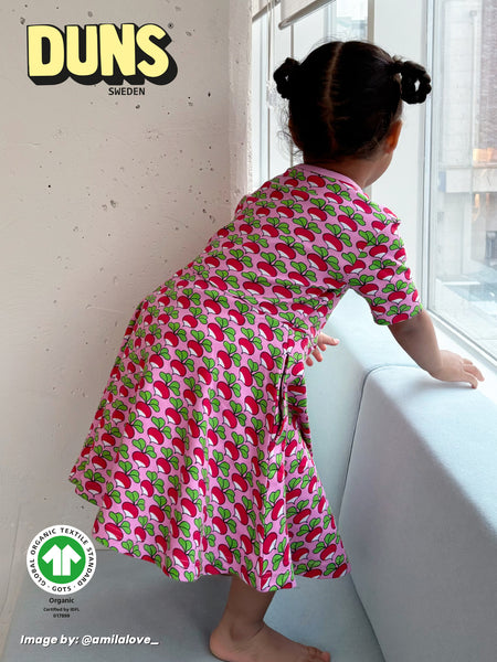Kortärmad klänning med vid kjol. Fickor i sidsöm